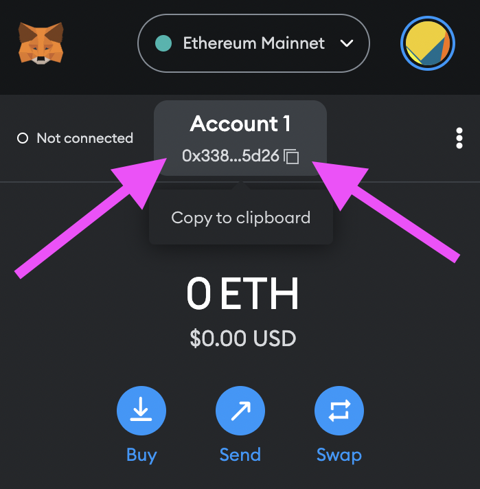 Jouw wallet heeft een ‘public address’, een beetje zoals je huisnummer. Bij MetaMask vind je die hier: