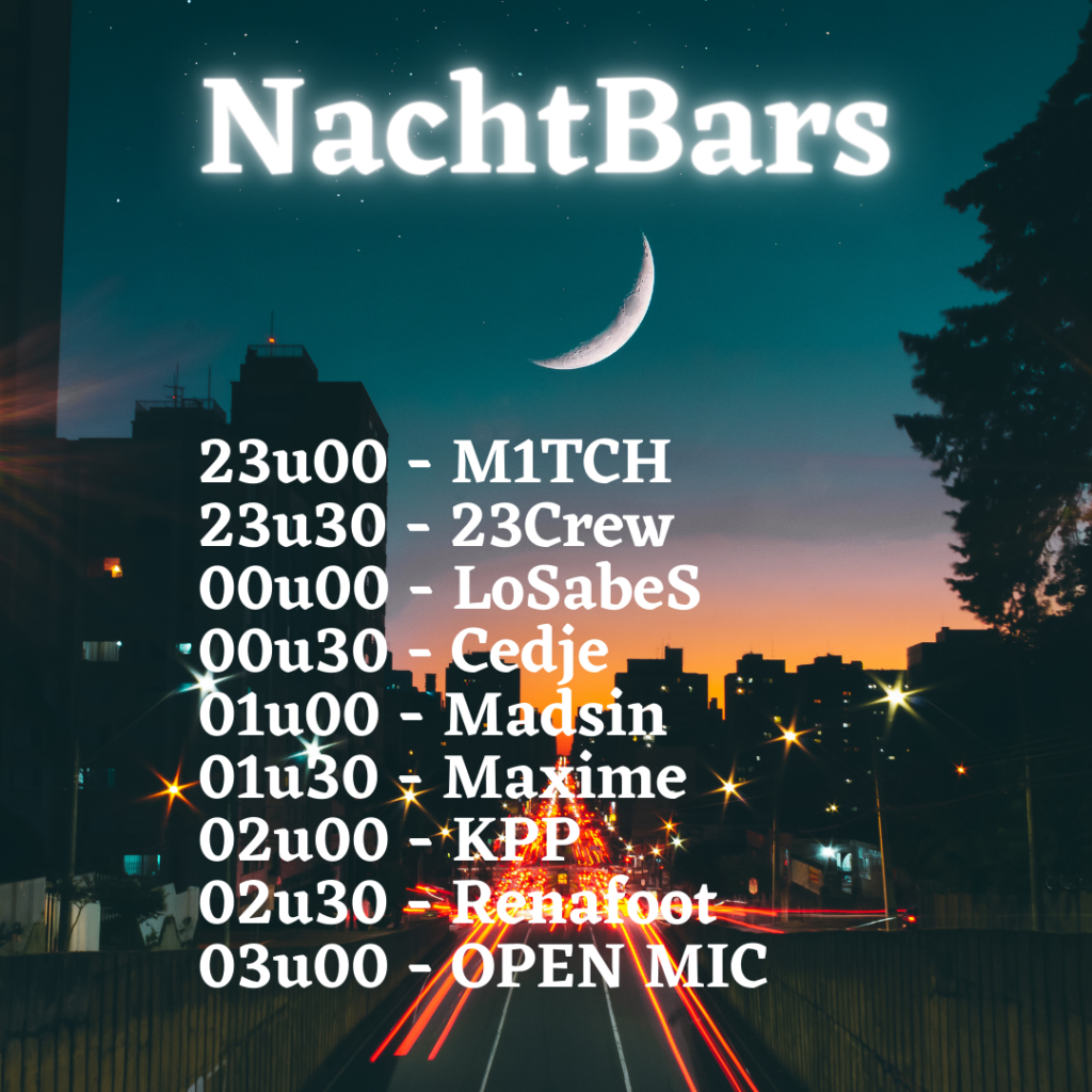 Met een line-up van artiesten uit heel Vlaanderen, in diverse stijlen – van grimy underground tot soulful melodies – allemaal met bakken talent… belooft het een afwisselende en dynamische avond te worden.